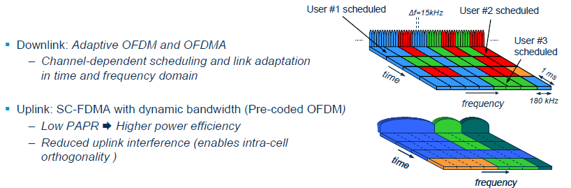 The LTE radio interface is based on OFDM (Orthogonal Frequency Division Multiplex) and OFDMA (Orthogonal Frequency Division Multiple Access) in DL and SC-FDMA (Single Carrier Frequency Division Multiple Access) in UL. These techniques are well suited for flexible bandwidth operation. This enables operators to deploy LTE in different regions with different frequency bands and bandwidths available.OFDM also shows very good performance in highly time disperse radio environments (i.e. many delayed and strong multi path reflections). That is because the data stream is distributed over many sub-carriers. Each sub-carrier will thus have a slow symbol rate and correspondingly, a long symbol time. This means that the Inter Symbol Interference (ISI) is reduced.